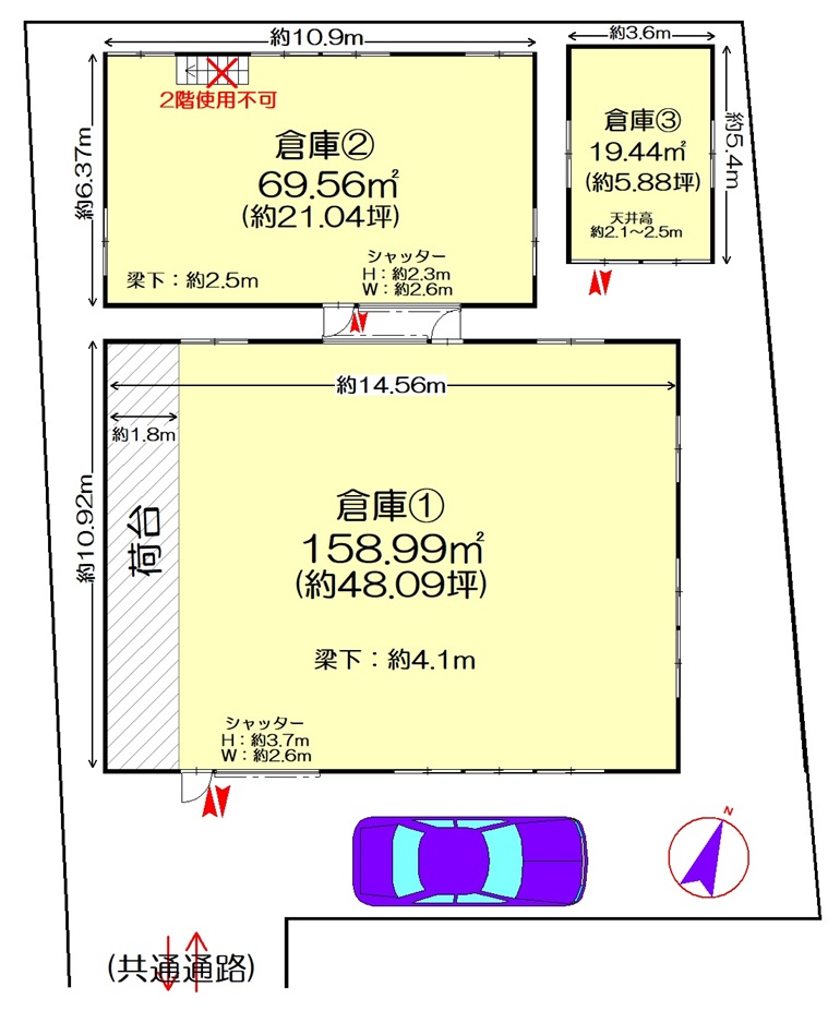 | 備考 | ■面積:①158.99㎡(約48.09坪)/②69.56㎡(約21.04坪)/③19.44㎡(約5.88坪)/ 合計247.99㎡(約75.02坪) ■構造:①軽量鉄骨亜鉛メッキ鋼板葺平家建/②軽量鉄骨亜鉛メッキ鋼板ぶき2階建 ■天井高:①梁下約4.1m/②梁下約2.5m/③約2.1m~約2.5m ■建築年月:①1986年6月/②1981年月不詳 ※倉庫③は未登記 |