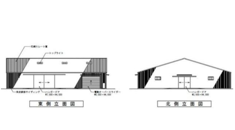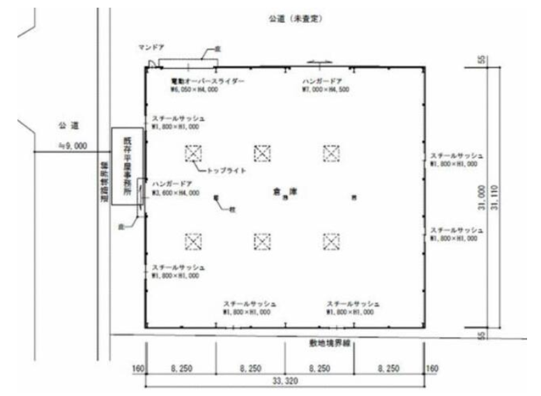 | 設備・条件等 | 電灯、動力、トイレ、事務所 ハンガードア(W7,000×H4,500) 電動オーバースライダー(W5,050×H4,000) |