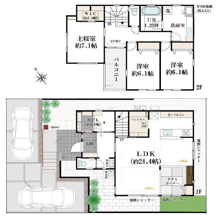 | 設備・条件等 | カースペース2台、ウォークインクローゼット、ビルトイン食洗器、パントリー ガス温水式床暖房、乾太くん、電動シャッター、太陽光発電システム |