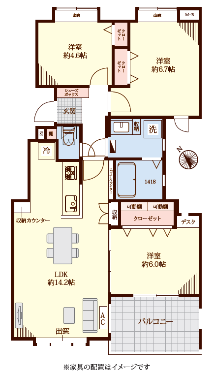 | 設備・条件等 | 間取り:3LDK (LDK約14.2帖、洋室約4.6帖、洋室約6.7帖、洋室約6.0帖) |