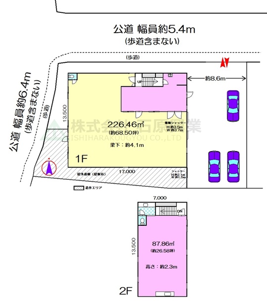 | 設備・条件等 | 1階:電動シャッター、トイレ、手洗い場、給湯器(残置)、エアコン2基(残置) 2階:トイレ、キッチン、流し台、エアコン(残置) |