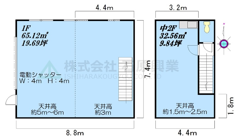 | 備考 | 面積:1階:65.12㎡(19.69坪)・中2階:32.56㎡(9.84坪)・延床:97.68㎡(29.54坪) 内装:1階工場:スケルトン(中2階棚有り)、2階事務所:スケルトン 天井高:1階梁下約5m最大高さ約6m・2階梁下約2.5m |