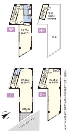 | 備考 | ■1階:27.33㎡(8.26坪)2階:29.25㎡(8.84坪)3階:29.25㎡(8.84坪)塔屋:3.00㎡(約0.93坪) ■エアコン3台・キッチン2か所・トイレ2か所※既存設備の維持管理費は借主負担 |