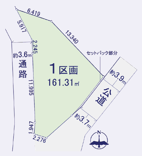 備考 | 南東側約3.7m~3.9mに約16.5m接道(西側否道約3.6m) 建蔽率60%/容積率160%(前面道路幅員制限) 敷地面積(実測):161.31㎡(※別途セットバック持分1.38㎡有) |