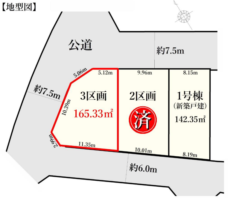 道路種別 : 公道 / 方向 : 南西 / 幅員 : 6.0m 接道2道路種別 : 公道 / 方向 : 北西 / 幅員 : 7.5m 接道3道路種別 : 公道 / 方向 : 北東 / 幅員 : 7.5m |