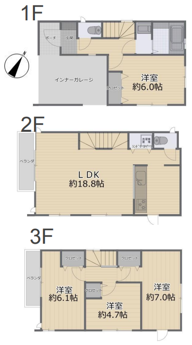 | 設備・条件等 | 床面積:1階23.6㎡、2階36.23㎡、3階36.23㎡ 合計96.06㎡ | ||