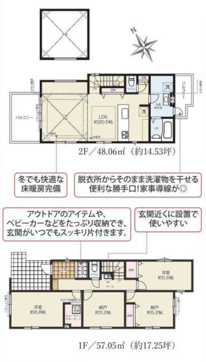 | 備考 | 建築確認番号:第24UDI1W建11669号 1階57.05㎡(約17.25坪)、2階48.06㎡(約14.53坪) 間取り:2LDK+2S |