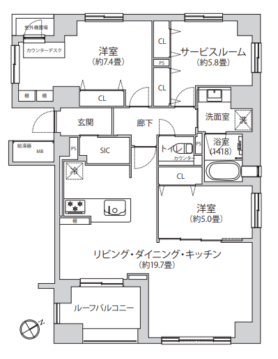 専有面積 | 90.51㎡ / 27.38坪 | バルコニー面積 | 7.65㎡ | ||