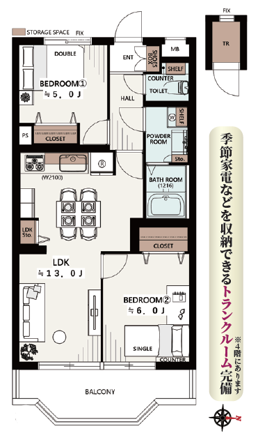 専有面積 | 54㎡ / 16.34坪 | バルコニー面積 | 6.29㎡ | ||