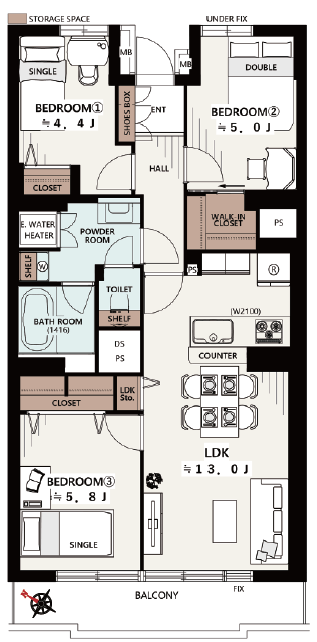 専有面積 | 71.27㎡ / 21.56坪 | バルコニー面積 | 7.49㎡ | ||